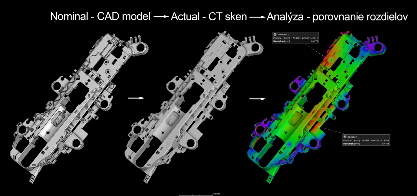 Analýza porovnáva nominálny CAD model s aktuálnym CT skenom dielu, aby sa určili odchýlky a geometrické rozdiely. Výsledky sú prezentované farebne kódovanou mapou odchýlok, čo uľahčuje identifikáciu oblastí mimo tolerancií. Tento typ kontroly je kľúčový pri overovaní kvality výroby a presnosti dielov oproti návrhu.